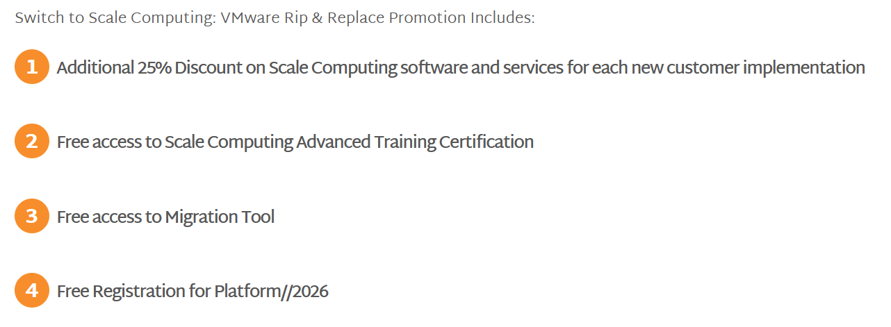 With this initiative, you can empower your VMware customers with a seamless transition experience while embracing the transformative capabilities of Scale Computing Platform (SC//Platform).